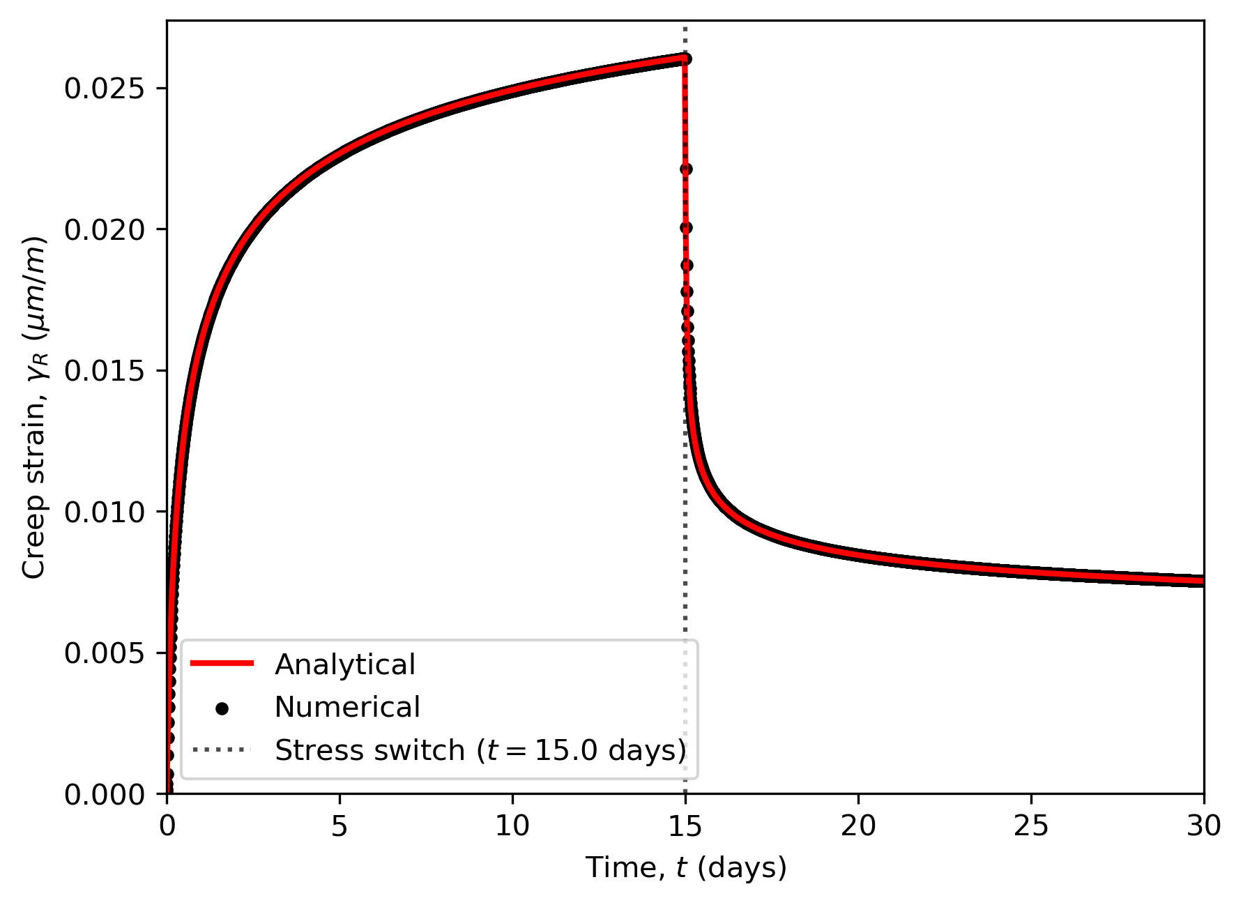 The following creep curve shows a comparison between the analytical and the numerical solutions of the modified Munson-Dawson model.